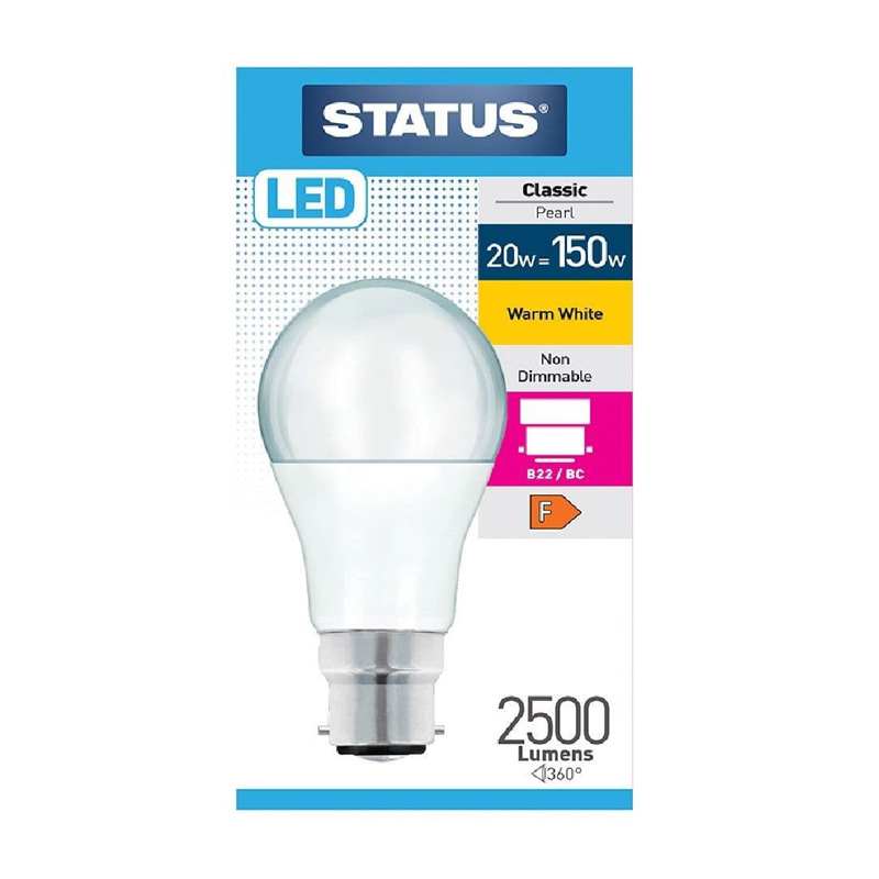 Illuminate your space efficiently with this pack of 10 Status LED GLS 20W BC (B22) bulbs. Designed for bright, consistent lighting, these bulbs offer the equivalent of traditional incandescent brightness with a fraction of the energy use. Featuring a bayonet cap fitting, they are perfect for a wide range of domestic and commercial fixtures. Long-lasting, low-heat, and eco-friendly, these bulbs deliver dependable performance while helping you save on energy bills.