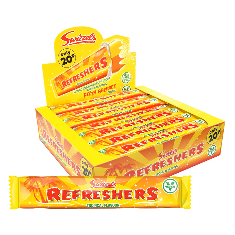 Swizzels Refreshers Tropical Chew Bars are a delightful, tangy treat that brings a burst of tropical flavour with every bite. Each 18g bar is packed with a zesty combination of fruity flavours, delivering a chewy and refreshing experience. Perfect for a quick snack or to satisfy your sweet tooth, these chew bars offer a fun and nostalgic taste of the classic Refreshers range. With their vibrant tropical taste, they are sure to brighten your day, whether you’re at home, work, or on the go.