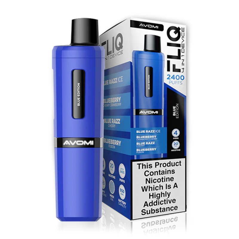 The Avomi FLIQ 4-in-1 Pod Kit is a smart and sustainable choice for vaping enthusiasts. Designed with a 950mAh rechargeable battery, it delivers up to 2400 puffs across four pods. Each draw offers vibrant, consistent flavour, and the hassle-free pod system requires no refilling or maintenance—just pop in a new pod and enjoy. A USB-C charging cable is not included. Replacing Your Pod – easily replace any used pods with any of the Avomi FLIQ pre-filled pods. 1 x FLIQ 4-in-1 Battery Component 950mAh 4 x 2ml Pre-Filled Pod (Blue Razz Ice, Blueberry Cherry Cranberry, Blue Razz Cherry, Blueberry Fusion)
