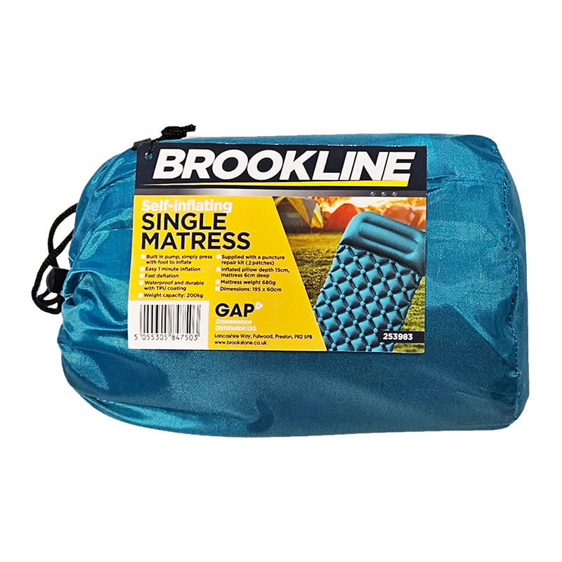 The Brookline Self-Inflating Single Mattress offers a quick and comfortable sleeping solution, ideal for campers and outdoor adventurers. Featuring a built-in foot pump, it inflates in just one minute and deflates quickly for easy packing. Its waterproof TPU coating ensures durability and protection against the elements, while the integrated pillow provides added comfort. Weighing only 680g and supporting up to 200kg, this compact mattress also comes with a handy puncture repair kit. Measuring 195 x 60 cm, it’s the practical choice for sleepers on the go.