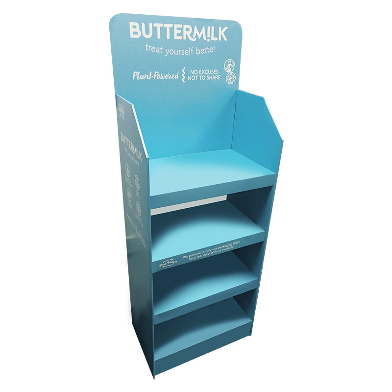 Empty Buttermilk floor stand for bold in store displays. Branded, sturdy and ideal for showcasing products in a clean organised layout.