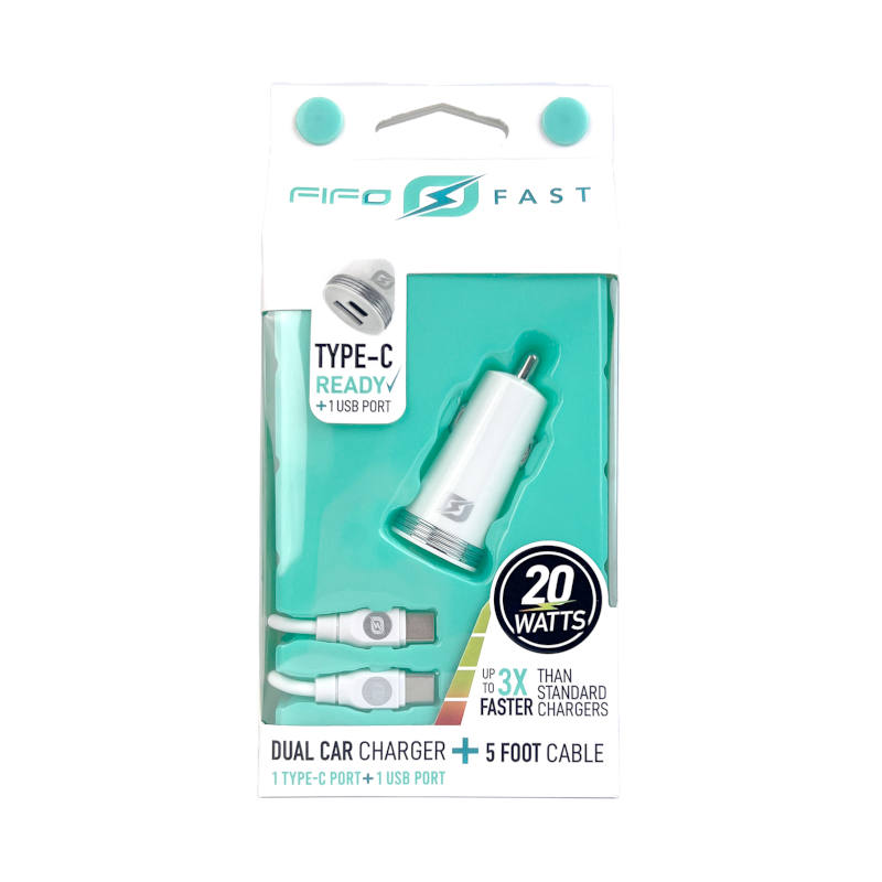The FIFO Fast Car Charger features a sleek design with a Type C port, ensuring rapid charging for your devices while on the go. It includes a durable 5-foot Type C to Type C cable for convenient connectivity. This charger is perfect for travellers, allowing you to keep your devices powered up during road trips or daily commutes. Experience efficient charging without compromising on quality or speed.