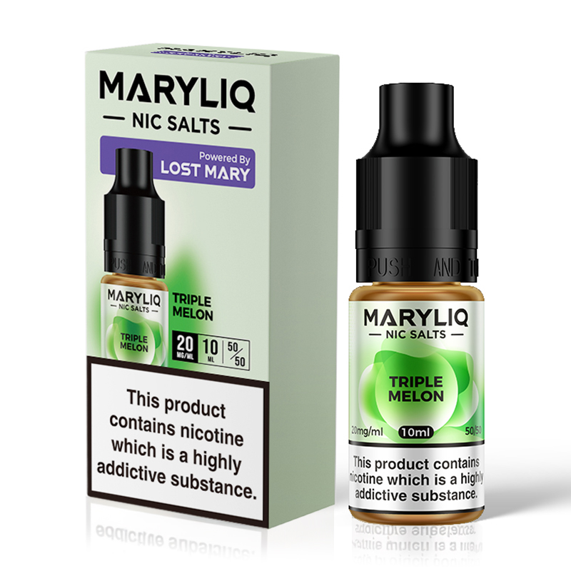MARYLIQ Nic Salt E-Liquid Triple Melon offers a refreshing blend of sweet watermelons, juicy cantaloupe, and ripe honeydew for a delicious vaping experience with a smooth throat hit.