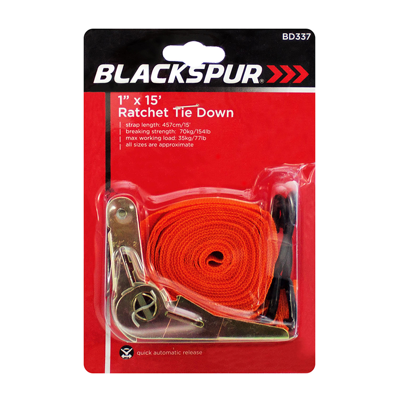 A ratchet tie-down is a secure fastening tool used to hold cargo in place during transport. Ideal for keeping your goods safe, secure & tight, this ratchet tie down is manufactured with 2 vinyl coated ‘S’ hooks, quick automatic release feature & has an adjustable length. It should not be used for lifting or towing vehicles.