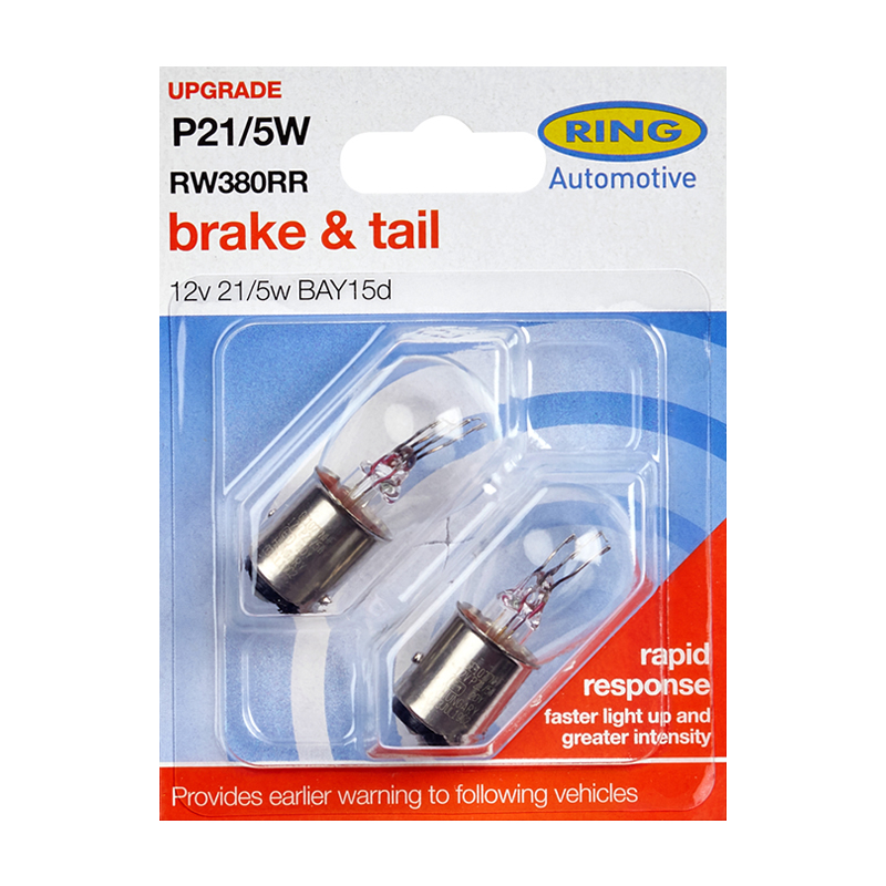 The Ring Twin RW380 Brake & Tail Bulb is a reliable lighting solution designed for enhanced visibility and safety on the road. Featuring a dual filament design, it functions as both a brake light and tail light, ensuring effective illumination in various driving conditions. Ideal for vehicles requiring P21/5W bulbs, this product offers easy installation and long-lasting performance, making it a practical choice for drivers seeking dependable lighting options.