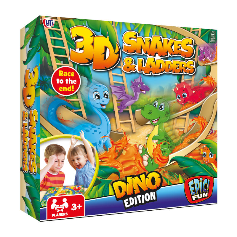 Snakes and Ladders 3D Game Dino Edition features a vibrant, three-dimensional design with colourful dinosaur-themed game pieces. Players navigate the board, climbing ladders to reach the finish while avoiding slippery snakes that send them back. This engaging twist on the classic game offers fun for all ages, encouraging strategic thinking and friendly competition. Perfect for family game nights or playdates!