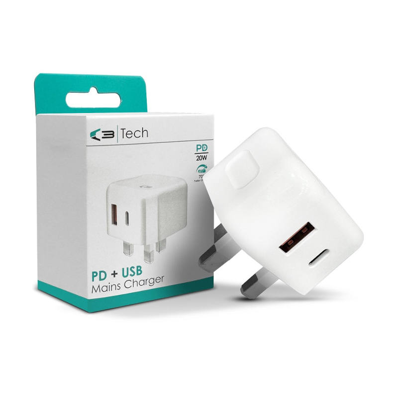The PD (Type C) & USB Mains Charger is a compact and efficient charging solution designed for quick power delivery. It features a Type C port that supports Power Delivery, allowing for rapid charging of compatible devices, along with an additional USB port for standard charging. Its sleek design makes it portable, ideal for travel, and it ensures safe operation with built-in protection against overcharging and overheating. Perfect for smartphones, tablets, and more. Display Included.