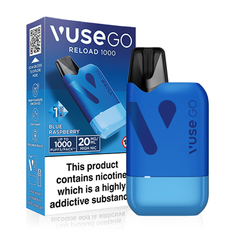 Vuse Go Reload Box Blue each filled with 20mg strength Blue Raspberry flavour for a refreshing vaping experience. Perfect for on-the-go use!